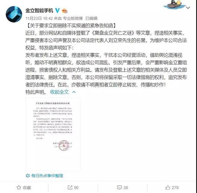 针对此前愈演愈烈的“金立董事长刘立荣赌输超过100亿”传闻,11月23日下午,金立曾发布声明称,文章捏造相关事实,严重侵害公司声誉及公司法定代表人刘立荣的名誉,会严重影响金立重组进程。