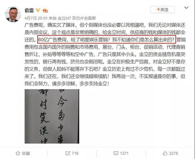但这一回应没有得到时任金立副总裁俞雷的认同,4月7日,他发微博称,60亿广告费用“不知道你们是怎么算出来的”。而10月31日,有金立“营销操盘手”之称的俞雷正式离职了。