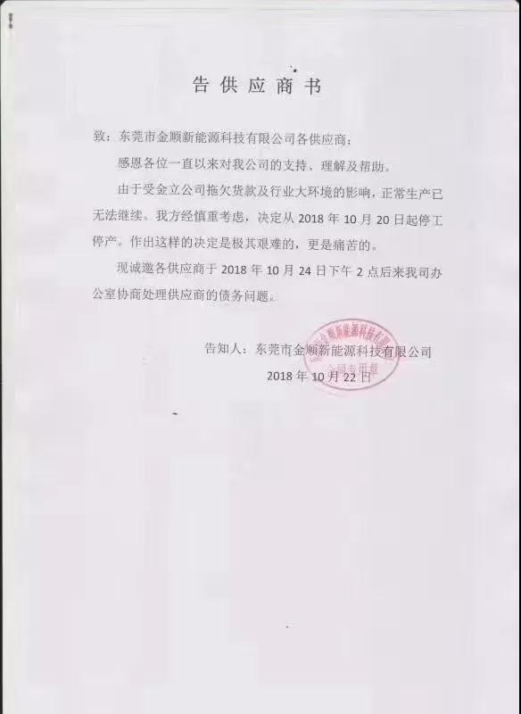 10月22日,东莞市金顺新能源科技有限公司发《告供应商书》称:“由于受金立公司拖欠货款以及行业大环境的影响,正常生产已无法继续,我方经慎重考虑,决定从2018年10月20日起停工停产。”(图片来源:第一财经日报相关报道)