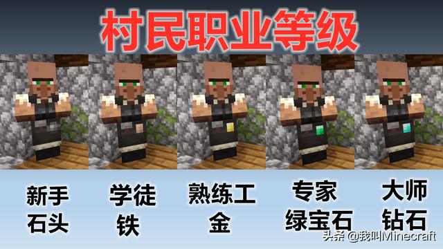 八、村民职业等级;在新版中,Minecraft的村民一共有五个职业等级,分为“石头(新手)、铁(学徒)、金(熟练工)、绿宝石(专家)和钻石(大师)。”等级越高,交易层级也就越高。提升村民等级就是不断与之交易。