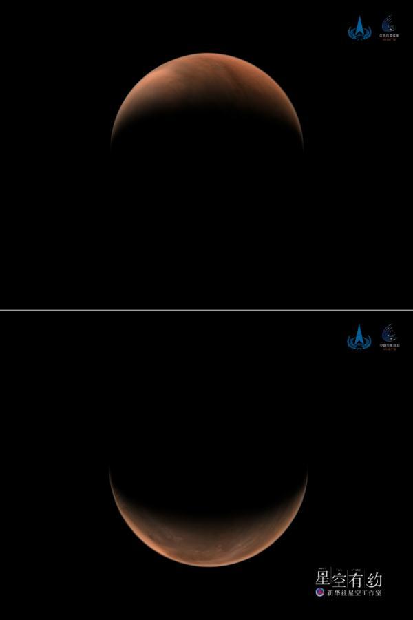 2021年3月26日,国家航天局发布2幅由我国首次火星探测任务天问一号探测器拍摄的南、北半球火星侧身影像。这是一张拼版照片,上图为:北半球上方火星影像;下图为:南半球上方火星影像。(新华社发)