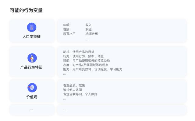 第三步骤收集整理到有效信息后,需要识别关键的行为变量,将调研到的用户与行为变量进行一一对应,并识别差异化行为模式。