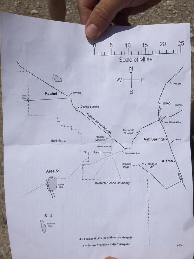 一路到375,车子看到不超过五辆,那个荒芜心里还有点暗爽……到了一个拐角点,有个小三角地,摆着一把椅子和一些小石头,有些游客留下的字条,无非就是画着外星人啥的,在这里遇到一对父子,我们简单交流了一下,那个爸爸很热情的给我看了他们准备的地图,也就是下面这张,也是他们给我们壮了胆,不然我们还真不会遇到下面的事情,他说他听说里面这条土路就是通往51区,他打算带他儿子去看看,其实我们也很好奇,于是打算搭伴一起,他爸爸随口来了句“ I follow you”,当时也傻,后来想想你看美国超速都是只罚第一台的,所以那个爸爸就是留了个心眼,不然他美国人干嘛要跟着我们!