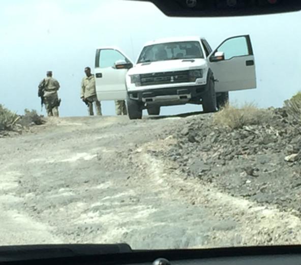 路上面的小山坡上有一台白色皮卡,我们想着说既然有人在上面,那我们也上去看看,顺便问问他们看到了啥,交流交流然后就返程。结果皮卡只不过是一个伪装的军用皮卡,没有迷彩,没有车牌,只有俩大兵和两把机关枪!