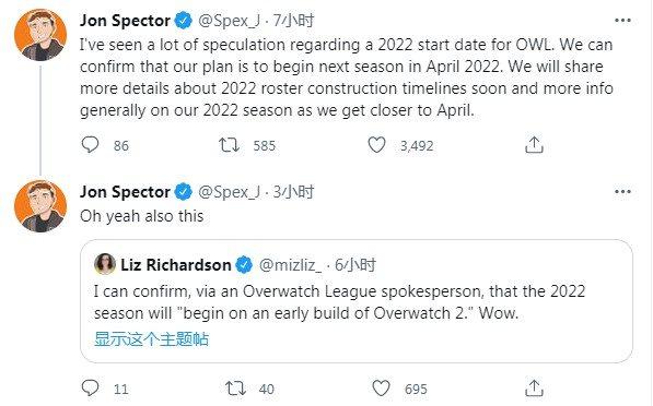 乔恩·斯佩克特称《守望先锋联赛(OWL)》2022赛季计划于2022年4月正式开始,而关于整个赛季的后续细节都将陆续公布。同时他还转载了电竞新闻媒体DotEsports新闻编辑的消息,证实即将于2022年开赛的《守望先锋联赛》新赛季将围绕《守望先锋2》的早期版本进行构建。