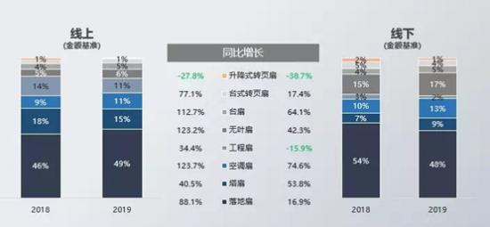 时间步入2020年中旬,加之今年气温格外高,北方地区刚刚步入六月就有突破40℃的趋势,这表明今年人们对风扇的需求很有可能会出现大幅提升。通过2019年中怡康数据可以发现:相较于2018年,各品类风扇几乎都处于上升趋势,其中无论线上线下,无叶风扇的增长在各类风扇中遥遥领先。