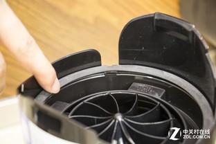 产品本身重量非常轻,净重达到了3.2KG。而且结构简单,容易拆卸。无论是要查看马达的工作状况还是要更换滤网,只需要轻按产品两侧的圆形按钮,便可取下产品的上半部分。