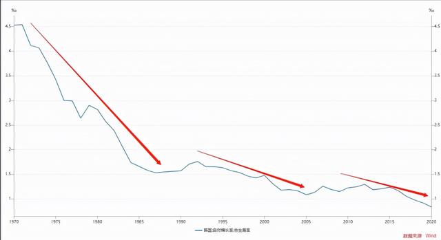 韩国的生育率,1970年代还有4.53; 2020年是0.84。