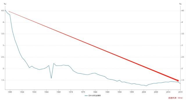 日本的生育率,1947年还有4.54; 2019年是1.36。