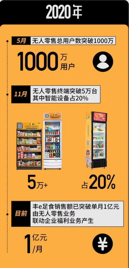 2020年11月,“丰e足食”无人零售终端突破5万台,其中智能设备占20%。其无人零售业务加企业业务销售额,已突破单月1亿元。
