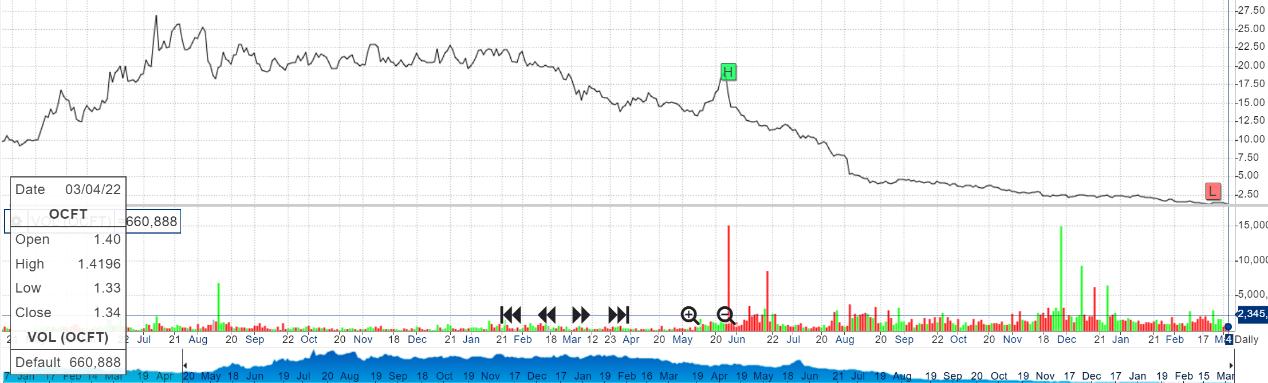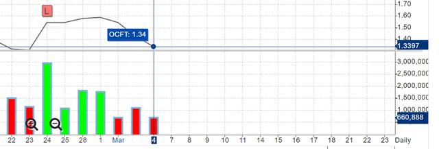 24日当天美股壹账通收盘价报1.55美元,上涨18.32%,但旋即迅速在3月4号交易日跌回1.34美元。
