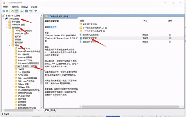 默认情况下,电脑会将系统限制在20%的带宽之内,如果该设置未配置或者禁用,电脑将使用默认值20%。点击Win+R,输入gpedit.msc,依次找到计算机配置--管理模板--网络--QoS数据包计划程序--限制可保留带宽,我们启用该配置,并将带宽限制改为0,这样我们就能使用100%带宽了。