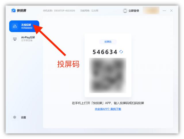 如果想要实现跨系统投屏,还是需要一款专业的投屏软件,这里以「快投屏」为例,在电脑端打开它,选择「无线投屏」功能,将会看到投屏码。