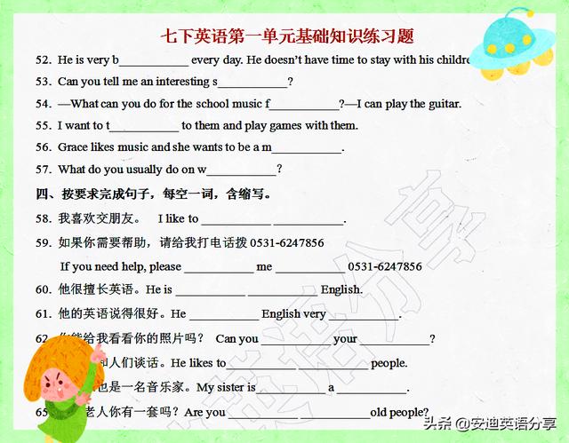 今天分享七年级下册英语第一单元基础知识练习80题;在学习完第一单元后,这80题可作为检测或知识巩固练习!共80题,至少正确68题才算合格,正确题低于60题,则需要再强化第一单元的基础知识!