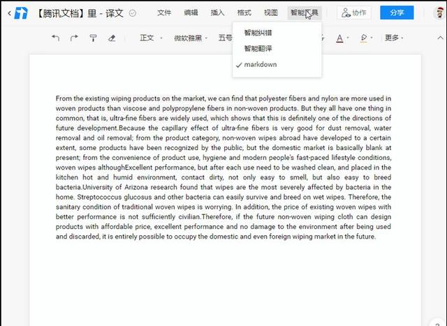 将文字复制到【腾讯文档】,点击「智能工具」里的「智能翻译」,就能立马得到翻译结果。