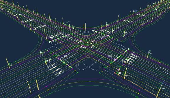 图9为点云自动化提取的结果,该过程是成图的关键步骤,通过点云分类结果和点云的强度值自动跟踪提取车道标线、路面标志、交通标志、护栏、路牙、杆状物、上方障碍物等路面、路侧、路上的交通设施和对自动驾驶有影响的附着物。提取的矢量数据根据识别结果自动赋属性值,和相邻的其他要素组织逻辑关系。