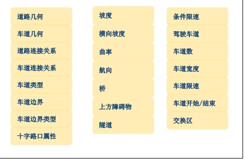 通常,要素完整的高精度地图,会通过三类数据来完整表达真实道路信息,第一类是道路和车道信息,主要记录道路信息及引导拓扑信息;第二类是道路周边设施信息,是定位和障碍物等辅助信息;第三类是定位图层,用于自动驾驶车辆现场匹配。