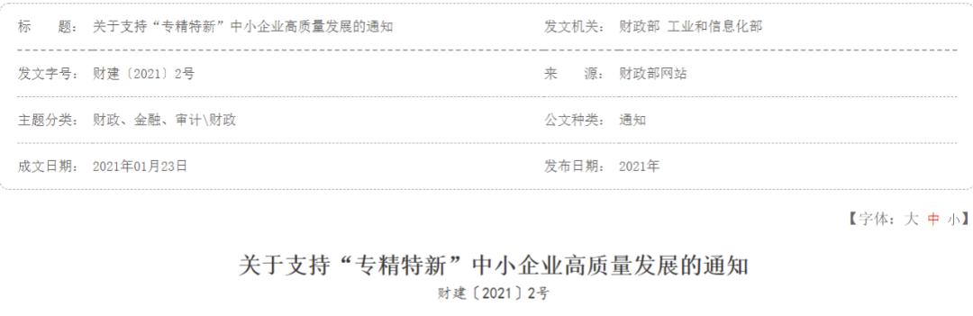 2021年1月23日,财政部、工业和信息化部联合印发《关于支持“专精特新”中小企业高质量发展的通知》,启动中央财政支持“专精特新”中小企业高质量发展政策。为让企业对申报相关事宜有更深入的了解,现对各地申报认定“专精特新”政策进行汇总。
