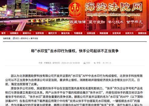 1月3日消息,据海淀法院网消息,因认为北京鹏图助梦科技有限公司开发并运营的“水印宝”APP中去水印行为构成侵权,北京快手科技有限公司以不正当竞争为由将该公司诉至法院,要求停止侵权、消除影响并赔偿经济损失及合理支出51万元。