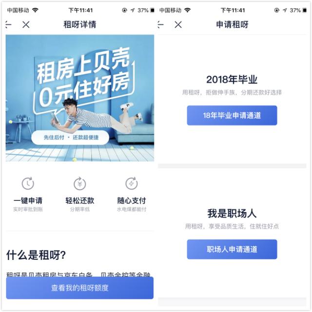 关于租房贷款,自如以前推出过针对应届毕业生的“海燕计划”。而贝壳找房似乎不满足于此,推出了针对应届毕业生和职场人的租房贷款申请。这两类群体几乎是租房市场的绝大多数用户。