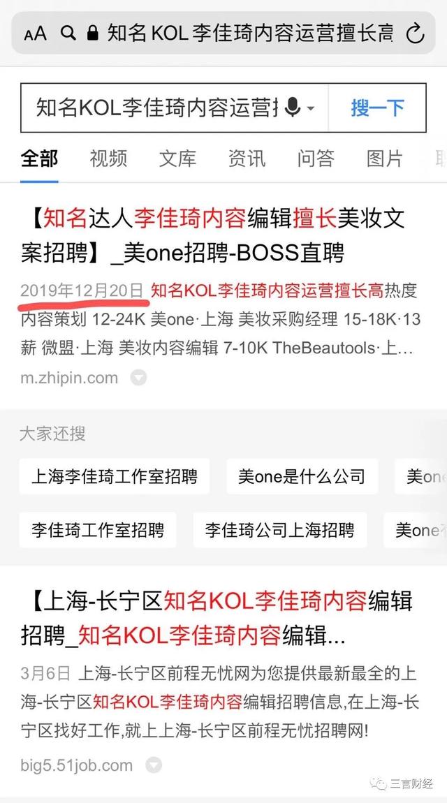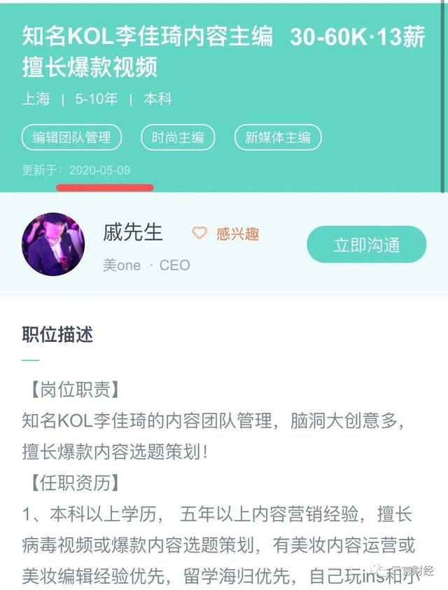 值得注意的是,据招聘平台上的时间显示,至少自5月7日起,美ONE开始在招聘平台上发布大量职务信息。经三言财经粗略统计,这些职务名称中包含“知名KOL”以及“李佳琦”等元素的岗位将近10个。