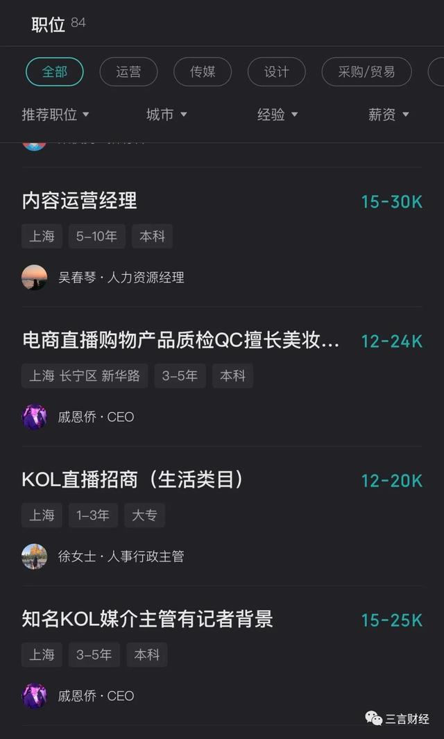 除了部分管理层岗位薪水在3万至6万之间外,大部分工作薪水待遇在1万至2万间,有的工作则不到一万元起步。例如这个“知名KOL李佳琦内容主编擅长爆款视频”的职位,待遇就是3万至6万。