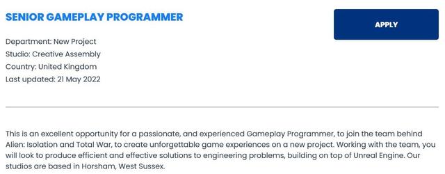 近日根据招聘信息显示,Creative Assembly正在使用虚幻5引擎打造一个全新的游戏项目,可能是一款太空科幻游戏?