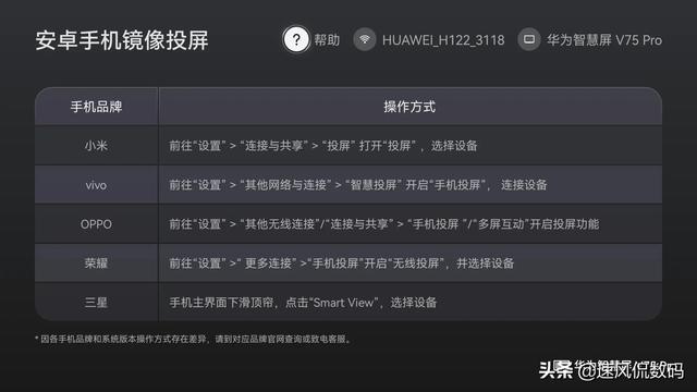 其他安卓手机镜像投屏,由于手机品牌和型号,系统版本等各异。这里给出了主流手机的操作方法。
