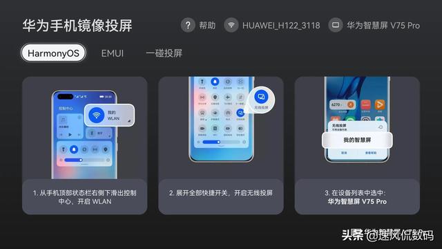 华为手机镜像投屏,基于HarmonyOS,EMUI和一碰投屏三种不同方式的操作方法描述了详细的步骤。