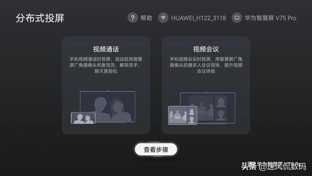 分布式投屏绝对是华为智慧屏最特色的投屏功能。在投屏过程中,如果手机正在使用通话类应用,则会自动启用智慧屏的摄像头和麦克风,让手机和智慧屏分布式运作,共同组成一个超级终端设备。