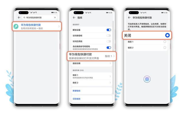 方法:打开设置>搜索华为钱包快捷付款>选择关闭或更换其它不常用的指纹。例如:当前您的常用解锁指纹和华为钱包快捷付款指纹都是指纹1,建议您将快捷付款指纹设置为指纹2。