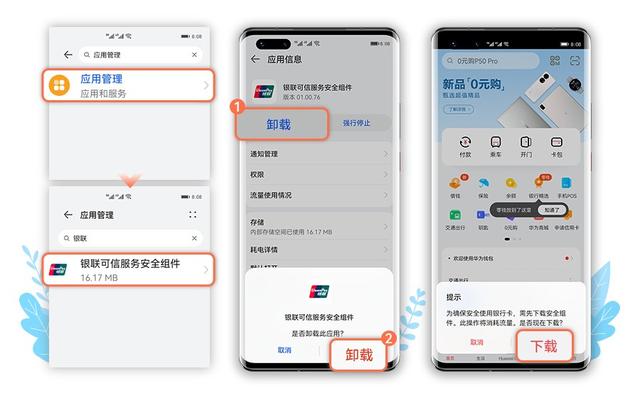 方法:打开设置>搜索应用管理>搜索找到银联可信服务安全组件>点击卸载。然后重新打开华为钱包,进入首页会自动弹出更新安全组件的提示,点击下载安装即可。