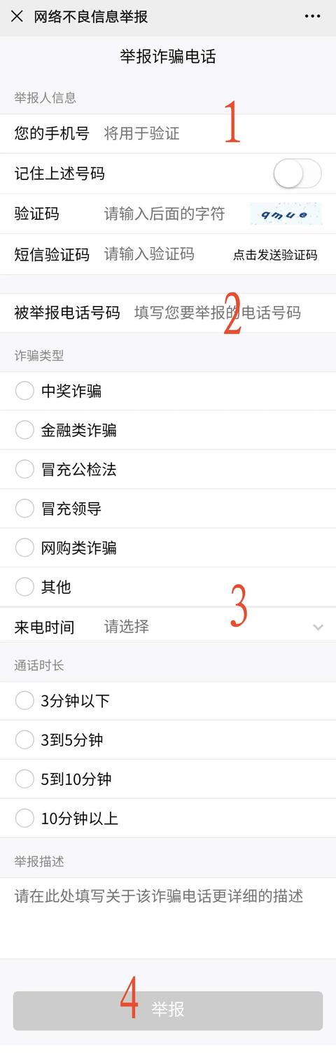 ③选择诈骗类型、来电时间及通话时长,填写举报描述。