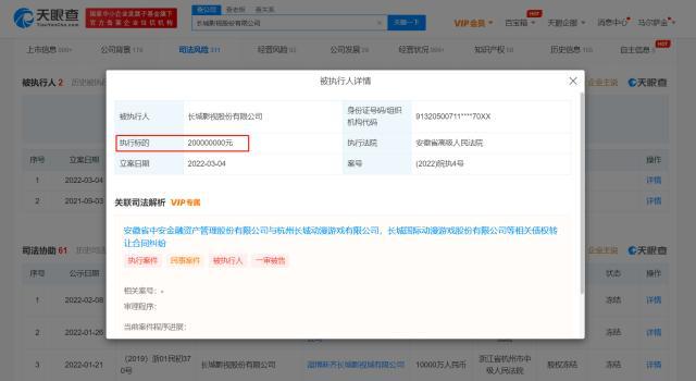天眼查App显示,近日,长城影视文化企业集团有限公司、长城影视股份有限公司、长城国际动漫游戏股份有限公司、杭州长城动漫游戏有限公司新增被执行人信息,执行标的2亿元,执行法院为安徽省高级人民法院,关联案件为债权转让合同纠纷。