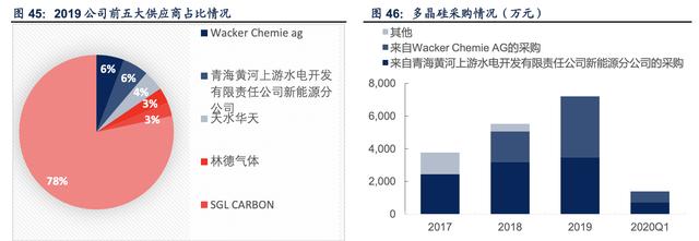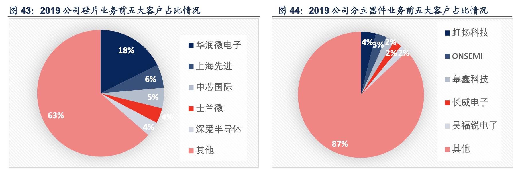 重要原材料可基本自给自足,供应商较为分散。分立器件业务的主要原材料包括硅抛光片、 硅研磨片和硅外延片,但由于子公司金瑞泓就是国内顶尖的硅片生产商,因此硅片原料的供 应十分安全。此外,公司除自己生产外延片外还向上海新傲、南京国盛等采购硅外延片,一 方面加强功率器件生产原料的供应安全,另一方面能够保障自身客户的供应。硅片业务方面, 多晶硅原料的采购对于公司的核心硅片业务影响较大。2018 年,公司拓宽了多晶硅的供应 渠道,新增了供应商 Wacker Chemie AG,以确保关键原料的供应安全。整体来看,公司供 应商较为分散,前五大供应商占比仅为 21.6%。