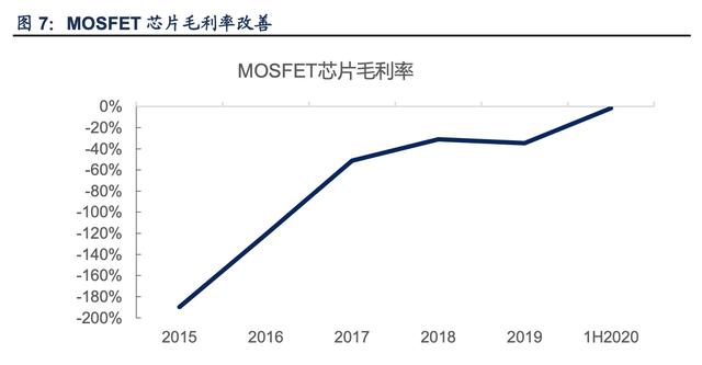规模效应下,MOSFET 芯片毛利率有望逐步转正。公司从 2013 年开始引入 MOSFET 产线, 2014 年投产并进行升级。近年来公司 MOSFET 芯片毛利率持续为负,主要系前期投入产线 设备等固定投资较大,单位固定成本较高所致。2018 年度,公司 MOSFET 芯片产销量增加, 平均单价也有所上升,负毛利情况较上年度明显改善。2019 年度,公司 MOSFET 芯片销售价格受市场整体价格走势影响有所下滑,公司经过工艺调整等手段也有效降低了单位生产成本,但由于整体销量未能实现显著增长,单位成本降低幅度低于单位售价降低幅度,使得本 年度 MOSFET 芯片负毛利情况未能得到改善。2020 年 1-3 月,因本期销售的 MOSFET 芯 片主要为上年末已计提跌价准备的库存商品,本期结转的单位成本大幅下降,负毛利率情况 改善较为明显。目前,公司 MOSFET 芯片产品的毛利率已从 2015 年的-189.71%改善到了 2020 年上半年的-1.60%,公司还在稳步推进 MOSFET 芯片的销量增长和毛利的转正。我们 认为,随着前期投入的完善和规模效应的显现,公司 MOSFET 芯片的毛利率提升明显,结 合公司预期,有望逐步实现转正。