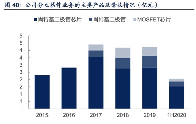 公司的主营业务按照大类分为硅片、半导体分立器件芯片、半导体分立器件成品和其他业务, 其中硅片是核心业务,占营收比重超 63%。公司硅片业务 2020 年 1H 实现营收 4.33 亿元, 同比增长 14.38%,该业务主要由子公司金瑞泓承担,主要产品包括硅外延片、硅研磨片和 硅抛光片。其中硅外延片的销量在 2018 年有了较大的提升,带动整体营收增长。分立器件 芯片(主要是功率器件芯片)是第二大主营业务,包括肖特基芯片和 MOSFET 芯片,2020 年 1H 实现营收 1.72 亿,同比增长 0.97%。其中肖特基二极管芯片是分立器件业务的核心。