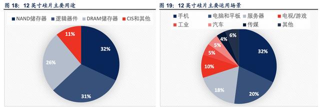 存储与逻辑是 12 英寸硅片最大市场,消费电子和服务器是主要应用场景。根据 SUMCO 的 测算,12 英寸硅片的主要用途包括制造储存器件和逻辑电路,储存器件主要包括 NAND 和 DRAM 储存器,总计占比大约 58%,其次是逻辑器件 31%。下游终端应用方面,12 英寸硅 片主要被用于消费电子和服务器。消费电子主要包括手机、平板、电脑、电视/游戏等,占比 超过 62%,用于服务器的占比也超过 18%。