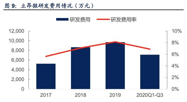 公司在研发方面的投入不断提升,加强公司技术储备。公司在过去三年中,投入的研发费 用率不断增长,从 2017 年的 5.63%提升到了 2019 年的 8.14%,研发投入金额上更是从 2017 年的 4025 万元猛增到了 2019 年的 8661 万元,实现翻倍式增长。公司在硅片、分立器件领域的持续投入将大大增强公司的竞争力,此外,公司在射频芯片领域的投入也将拓 宽公司的竞争赛道。