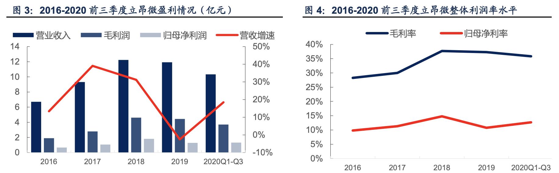 立昂微近年来整体业绩增速迅猛,盈利水平也在稳步提升。2016-2020 年 Q1-Q3,公司分别 实现营收 6.70 亿元、9.32 亿元、12.23 亿元、11.92 亿元和 10.33 亿元,归母净利润 0.66 亿 元、1.06 亿元、1.81 亿元、1.28 亿元和 1.31 亿元。2016 年-2018 年,受益半导体行业景气 度上行驱动,公司营收增速保持在 30%以上。但 2019 年半导体市场整体遭遇下滑,公司营 收也受到一定的影响出现小幅下降。2020 年前三季度虽受疫情影响,公司仍实现营收 10.33 亿元,同比增长 18.41%;实现归母净利 1.31 亿元,同比增长 19.40%。其中 2020 年第三 季度受益下游代工景气向好,公司实现营收 3.84 亿元,同比增长 34.76%;实现归母净利 0.55 亿元,同比增长 83.81%。
