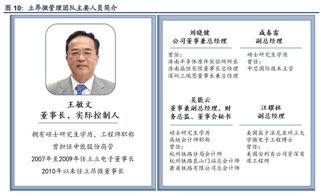 年任立立电子董事,2010 年以来任立昂微董事长。 公司高管大多拥有工程、管理相关的知识背景,从业经验丰富。管理团队大多有下游龙头客户的任职经历,便于帮助公司建立客户信任和拓展销售渠道。