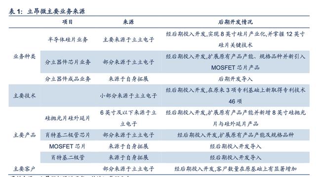 立昂微是国内半导体功率器件细分领域的领先企业,17 年被评为中国半导体器件 10 强企业 第 8。立昂微的主营业务是半导体功率器件,其中主要产品是肖特基二极管芯片、肖特基二 极管和 MOSFET 芯片,其合作伙伴主要包括安森美、阳信长威电子有限公司、扬州虹扬科 技发展有限公司等国内外半导体企业。