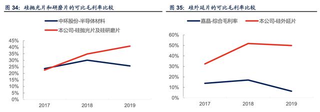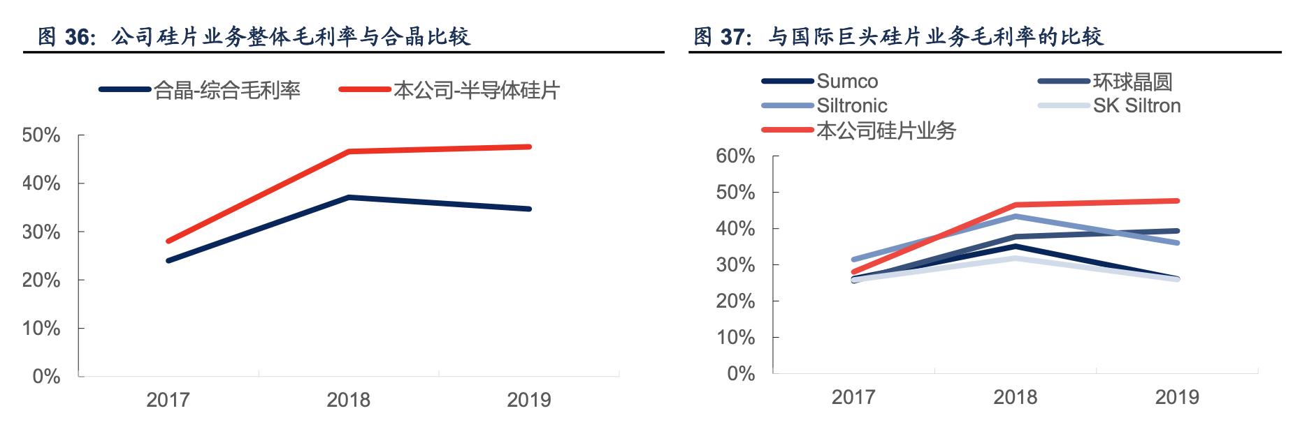 对比来看,公司目前是国内硅片生产企业中少有的毛利率能够达到甚至超过国际巨头的企业。 受益于长期多晶硅价格的下跌,公司 2019 年的硅片业务毛利率在 2018 年实现了较大幅度 的提升,从 28.05%提升到 46.55%;2019 年公司提高了毛利较高的外延片的销售比例,因 此毛利继续提高到 47.63%。对比来看,龙头公司中的毛利最高的环球晶圆为 39.35%,公司 综合毛利率比环球晶圆还高 8.28 个百分点。