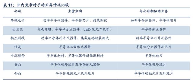 由于公司业务主要分为硅片、分立器件和砷化镓芯片三大类,分别对标中环股份、沪硅产业;扬杰科技、新洁能、捷捷微电、士兰微;和卓胜微。