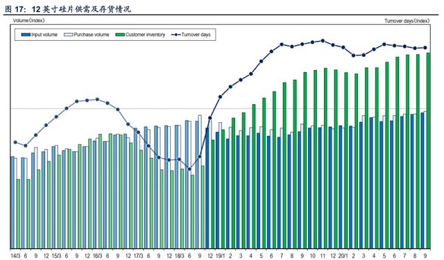 行业景气度提升带动客户硅片实际生产需求量回暖,12 英寸供需仍趋于紧张。2018 年以来, 受不确定性增加的影响,12 英寸硅片客户进行了两轮较大规模的囤货。第一轮从 2018 年 7 月中美贸易冲突升级开始,持续到 2019 年 10 月;第二轮开始于 2020 年疫情时期,不过幅 度较小。与此同时,12 英寸硅片供应缺口也随着客户的囤货增加而扩大,客户的存货周转天 数不断上升。此外,2019 年下半年以来,下游企业实际用于生产的硅片需求也在不断增加。 2019 年 9 月以来,市场景气度也有明显的回暖趋势,实际用于生产的 12 英寸硅片需求量明 显增加。同时,据环球晶圆表示,2021 年产业景气度更优于今年。由于各硅片厂产能扩产幅 度小增加,未来 2 年并无新厂完工投产,供给增加有限,供需情况仍趋于紧张。