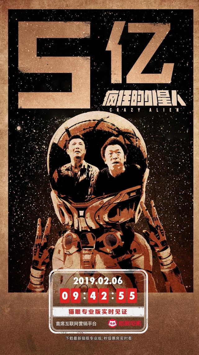 根据猫眼专业版数据显示,截止至2月6日9点42分,《疯狂的外星人》票房累计突破5亿人民币,猫眼评分8.6分。
