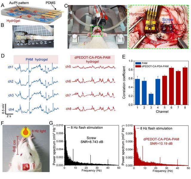 基于以上优异性能,为了全方位评估该水凝胶作为脑机接口的应用潜力,研究人员与电子科大合作开展水凝胶原位转印电路构建的植入式脑机接口,其可以准确地记录颅内皮层脑电信号(ECoG)。(图5)