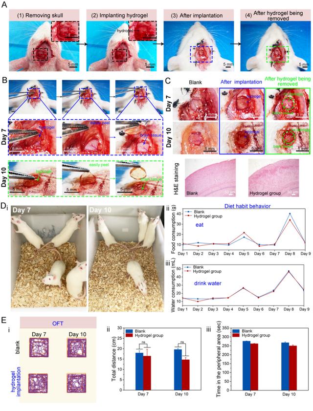 进而,为了探究水凝胶与脑部组织的相互作用,将水凝胶植入脑组织上,通过苏木素-伊红染色(病理组织切片最经常最广泛使用的一种常规染色法)和动物饮食行为、情绪评估等,证实植入式水凝胶脑机接口具有出色的生物相容性,不会对脑组织造成损伤,并在植入后可被无损取出。