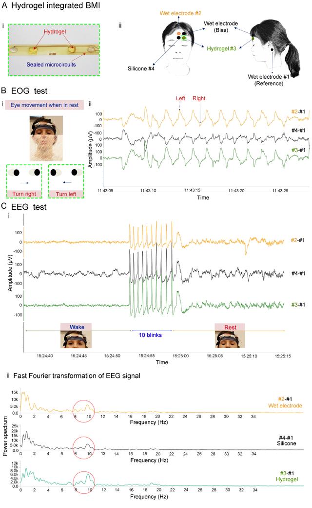 图6. 组织粘附、超软 BMI 用于表皮脑电信号和眼电信号(EOG)的记录。