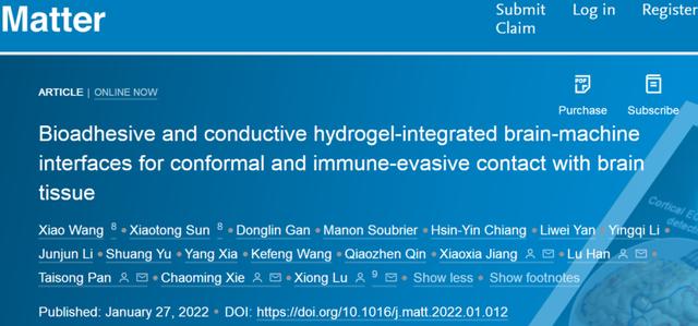 1、Wang, X., Sun, X., Gan, D., Soubrier, M., Chiang, H. Y., Yan, L., ... & Lu, X. (2022). Bioadhesive and conductive hydrogel-integrated brain-machine interfaces for conformal and immune-evasive contact with brain tissue. Matter.